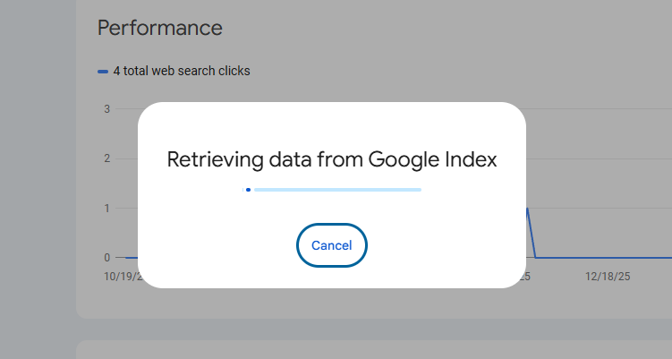 输入链接后,系统会自动进入“Retrieving data from Google Index(正在从 Google 索引中检索数据)”的状态,请静候系统完成对该网址当前收录情况的检测。