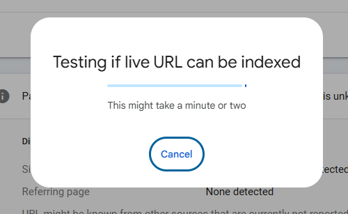 点击后,系统会启动“Testing if live URL can be indexed(正在测试实际网址是否可以编入索引)”的实时测试过程,这一步是为了确保您的网页当前是可以正常访问且符合收录标准的,通常需要等待一到两分钟。