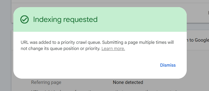 当页面弹出带有绿色对勾图标的“Indexing requested(已请求编入索引)”提示框时,说明该网址已成功加入 Google 的优先抓取队列。您只需点击“Dismiss”关闭弹窗并耐心等待 Google 爬虫处理即可,无需针对同一页面反复提交,因为多次提交并不会进一步提高抓取的优先级。