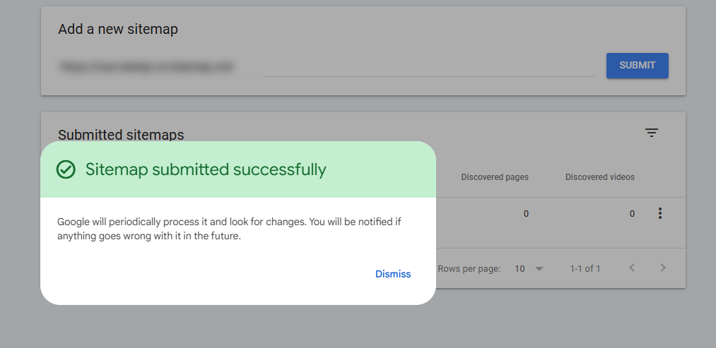 这表示 Google 已经成功接收了您的请求,您可以点击“Dismiss”关闭弹窗。随后 Google 会定期处理该地图文件并自动寻找网站上的变更,您可以在下方的“Submitted sitemaps”列表中实时查看已发现的页面数量和抓取状态。