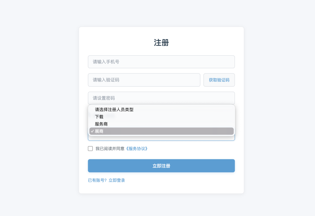在展会启动初期,参展商、展会服务提供商以及主办方需要先通过前端页面进行会员注册。