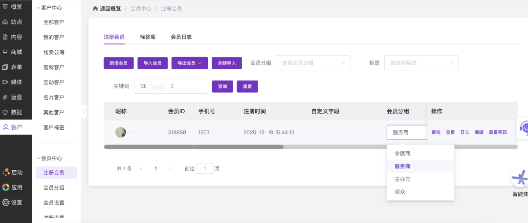 管理员需进入后台的注册会员列表,对这些角色进行身份审核,并通过点击操作栏中的“编辑”或直接点击“会员分组”字段,将其归类到对应的身份组中(如参展商、服务商等),只有审核通过并正确分组的用户才能登录对应的控制台。