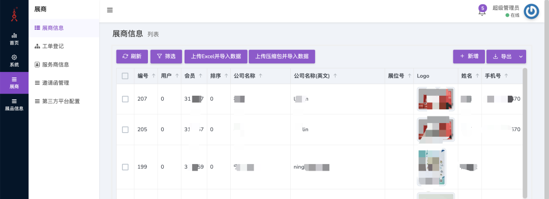 主办方可以在后台根据实际需求创建或配置自定义应用,并根据需要增加特定的字段信息。在管理端的“展商信息”列表中,您可以集中查看所有已入驻展商的编号、展位号、公司名称以及联系方式,并支持通过 Excel 或压缩包的形式批量导入数据,快速建立展商数据库。