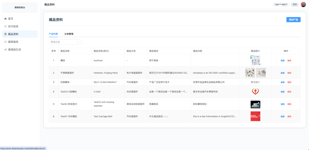 如果需要展示具体的参展产品,展商可以进入“展品资料”模块。点击“添加产品”按钮后,可以输入展品的名称、分类及描述,并上传产品实物图片。在展品列表页面,展商可以随时对已上传的内容进行编辑或删除,管理流程类似于简易的电商后台。