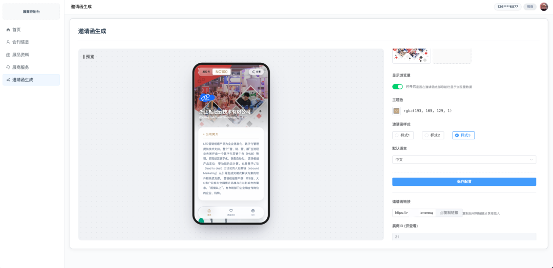 为了帮助展商吸引更多观众,系统提供了“邀请函生成”功能。展商只需在配置页面选择预设的样式(如样式1/样式2/样式3),并设置符合品牌视觉的主题色,系统便会自动生成电子邀请函。
