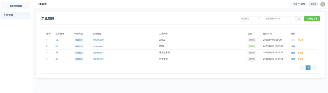 对于负责现场干活的服务商(如电工、家具商),系统提供了专门的“服务商控制台”。