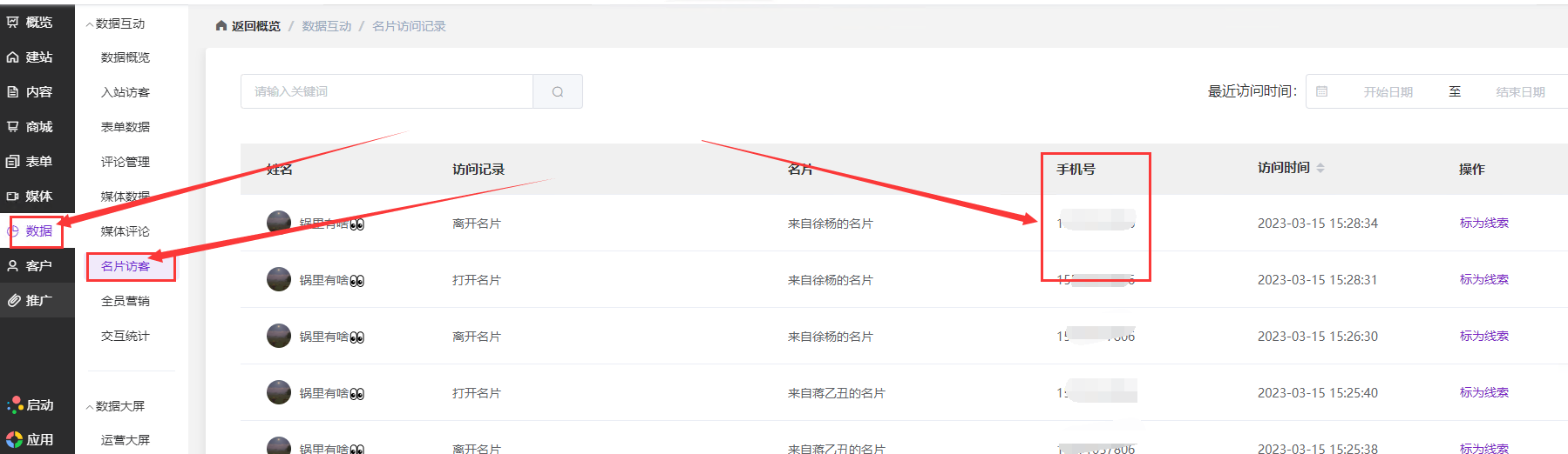 进入名片访客页面后,在访客记录列表中可以清晰地看到每一条访问明细。列表中包含了访客姓名、具体的访问动作(如打开名片、离开名片)、访问时间,以及该访客是从谁分享的名片链接进入的。对于已授权信息的访客,其手机号会直接显示在对应的“手机号”列中,点击右侧的“标为线索”还可以将高意向访客快速转入客户管理系统进行跟进。