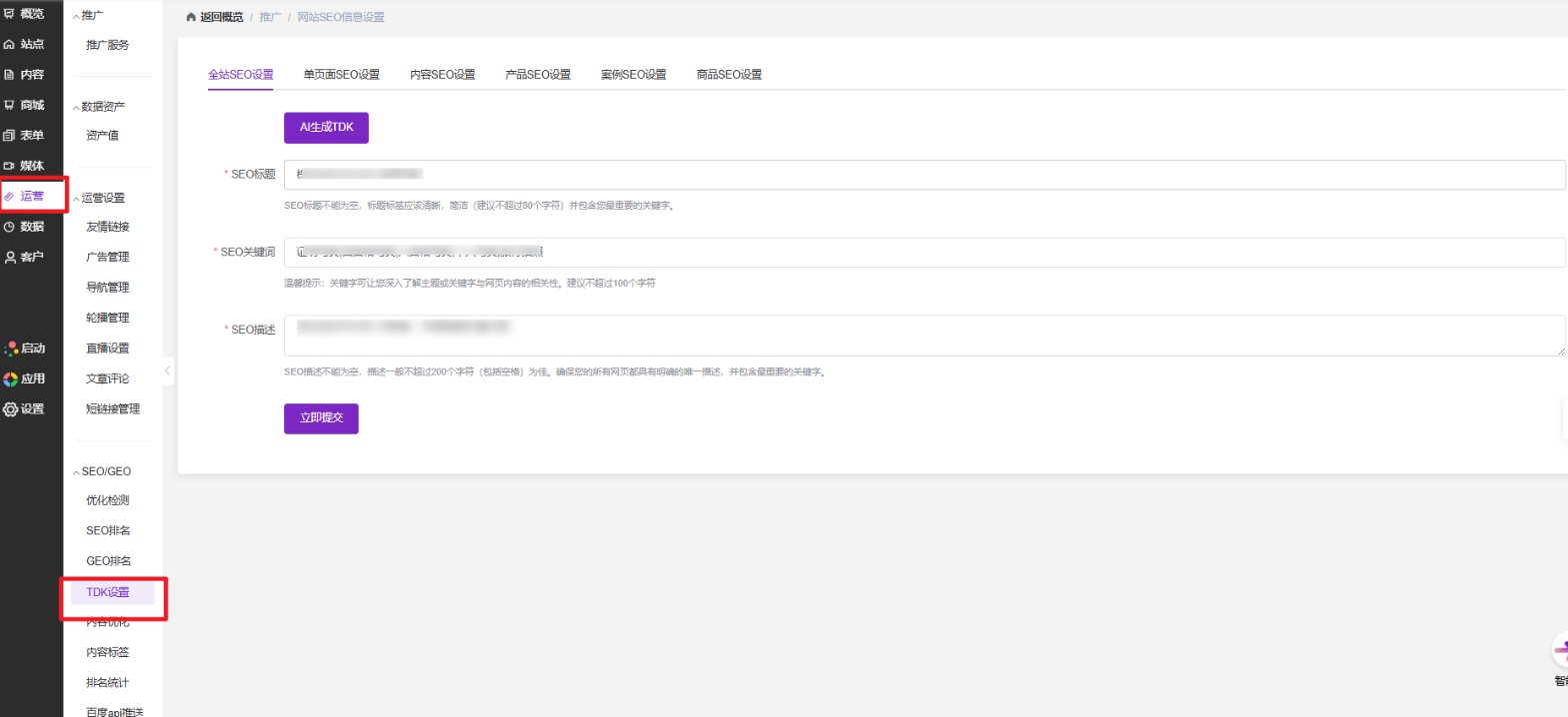 操作路径:官微中心后台—运营—SEO/GEO—TDK设置;