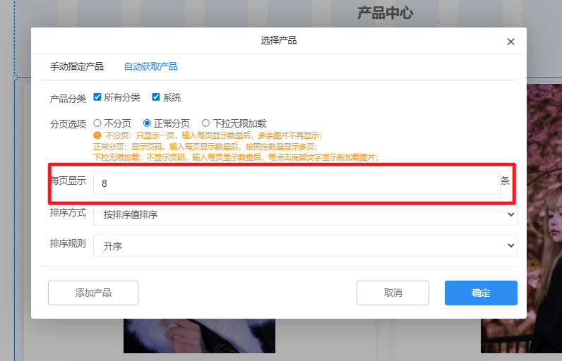 网站编辑器中产品中心模块显示的产品数量不全应该怎么设置增加?