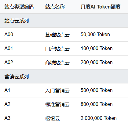 基础站点云 (A00) 每月包含 5 万 Token,门户站点云 (A01) 包含 10 万 Token,而商城站点云 (A02) 则提供 20 万 Token 的支持。