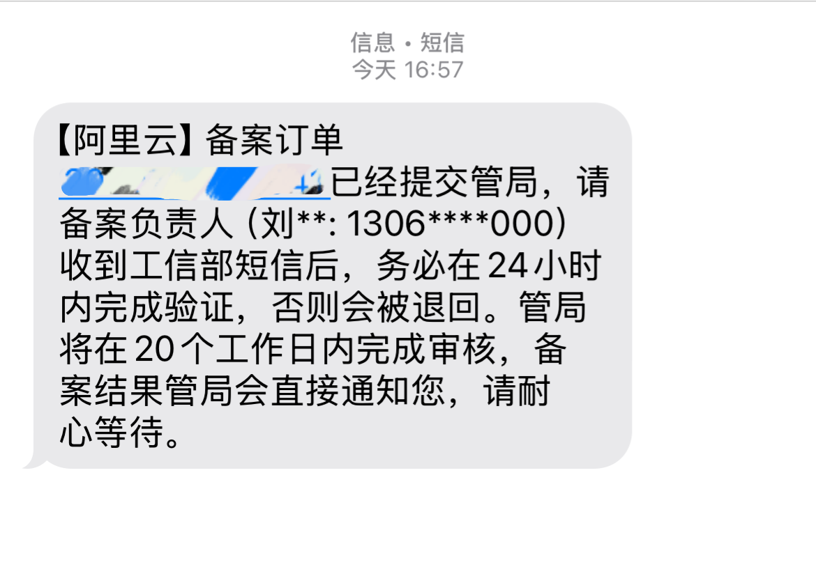 收到短信后,验证码有24小时的有效期,要在24小时内完成核验。如果24小时内未完成核验,或连续输错超过5次,备案申请将被自动退回,需要您修改后重新提交。