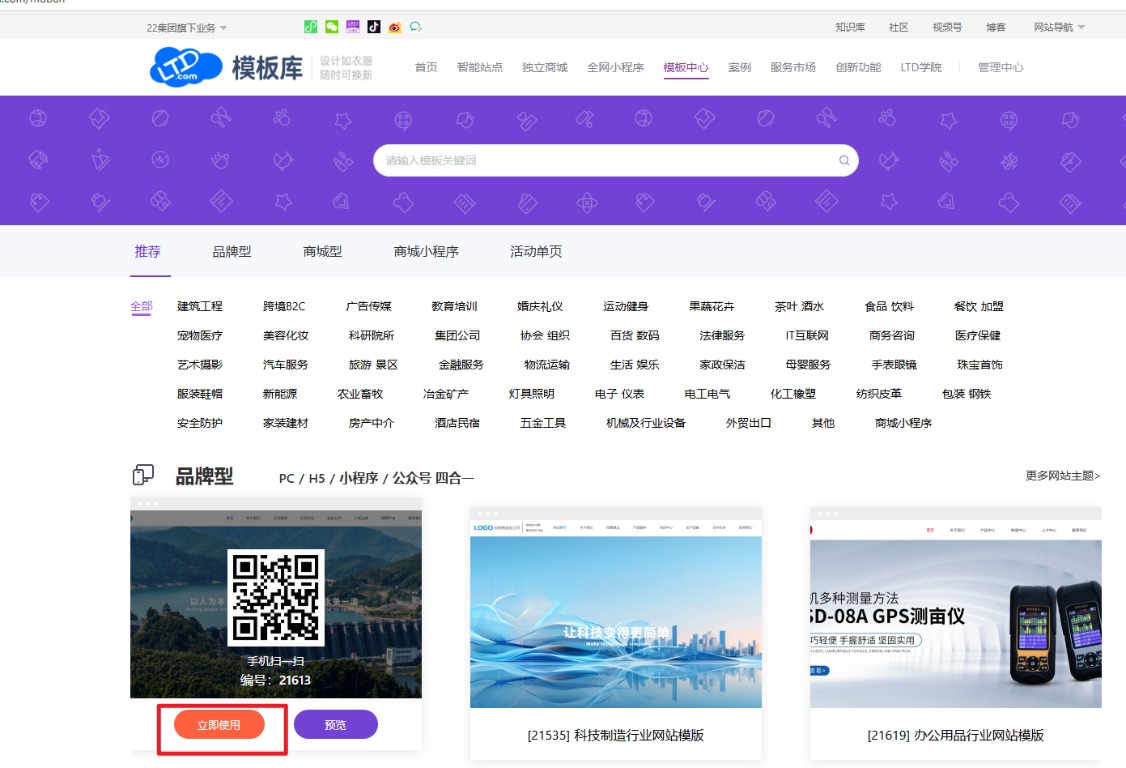 进入模板中心页面后,您可以根据站点的功能定位(如品牌型、商城型等)或者所属的行业分类进行筛选。在琳琅满目的模板库中,您可以直接输入关键词搜索,或者通过行业标签快速定位到适合的模板。
