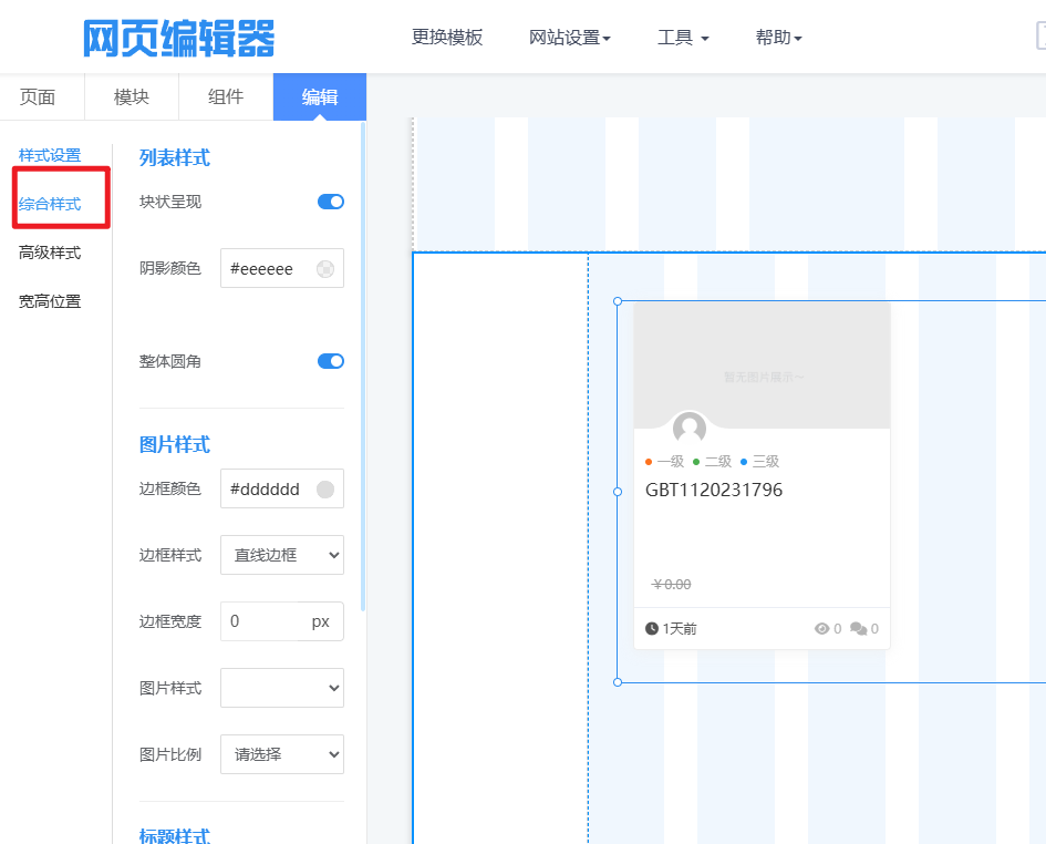 操作路径:网页编辑器—点击目标产品展示组件—左侧侧边栏“编辑”—样式设置—综合样式;