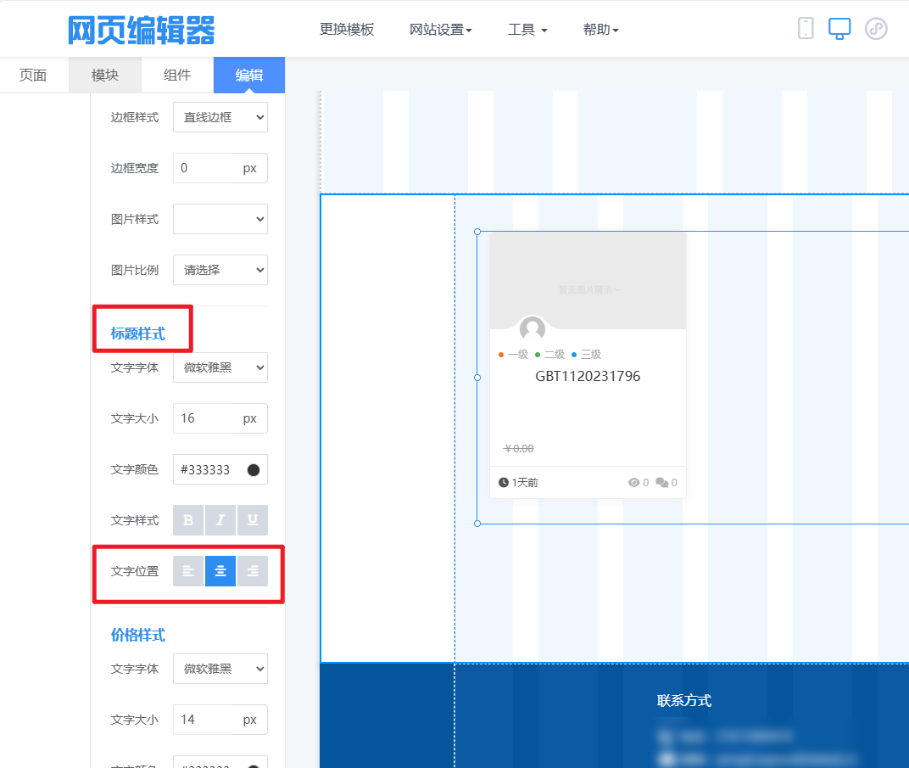 网站编辑器中产品展示组件里的产品标题应该怎么调成居中显示?