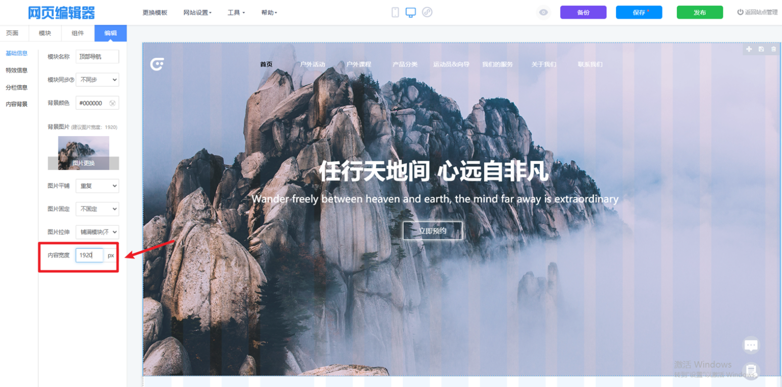 您可以将输入框中的数值改为更大的数字,例如输入 1920 可以实现大多数电脑屏幕下的满屏显示效果。修改后您会看到编辑区蓝色的辅助线向两侧张开,原本拥护的内容会自动填充到新的边界,确认效果满意后点击页面右上角的保存并发布即可。
