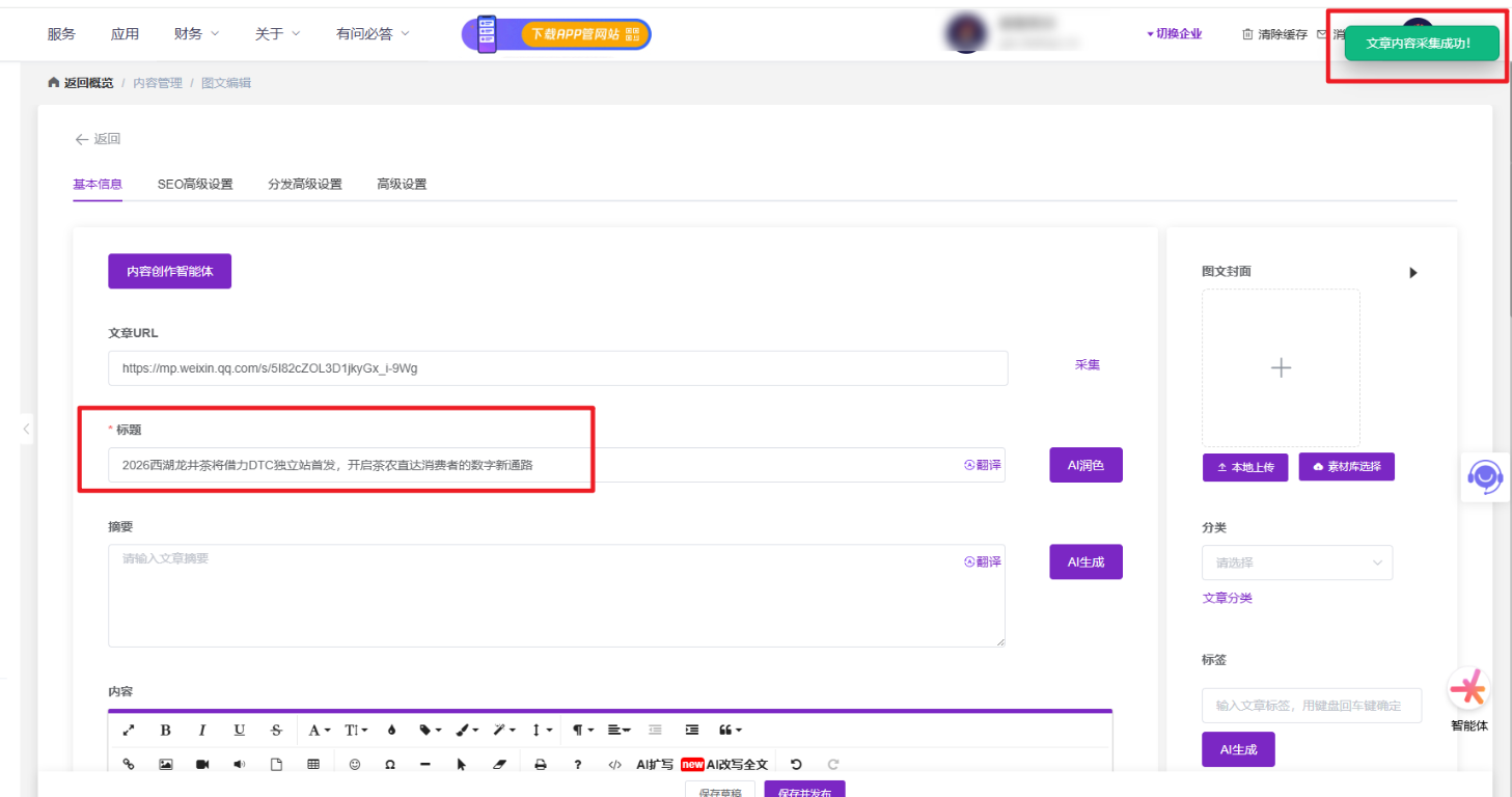 此时插件会自动介入辅助抓取,当页面右上角提示“文章内容采集成功”时,文章的标题、摘要及正文内容便会自动填充到对应的编辑器位置,您只需根据需要进行简单润色即可保存发布。