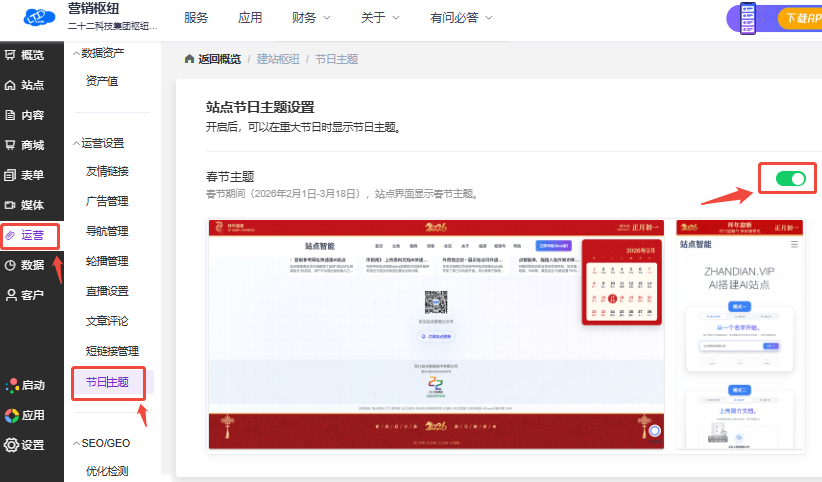 登陆打开您的营销枢纽后台,打开运营在运营设置中找到节日主题,就会看到春节主题皮肤,点击右上方选项即可开启体验春节主题皮肤。