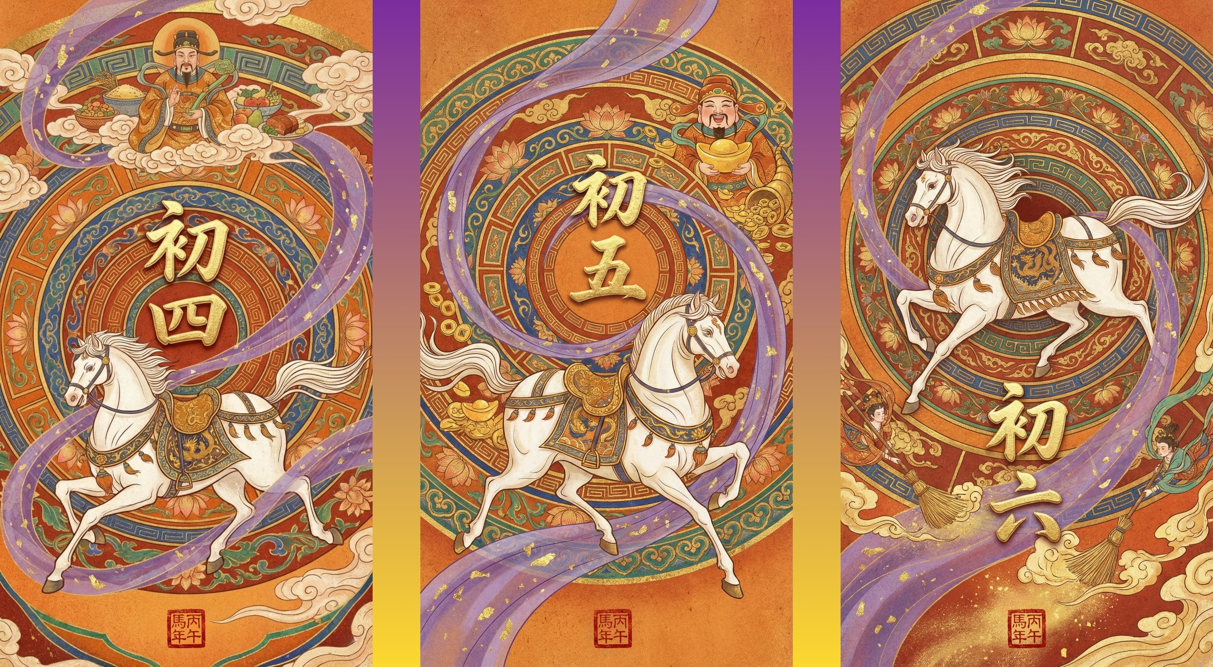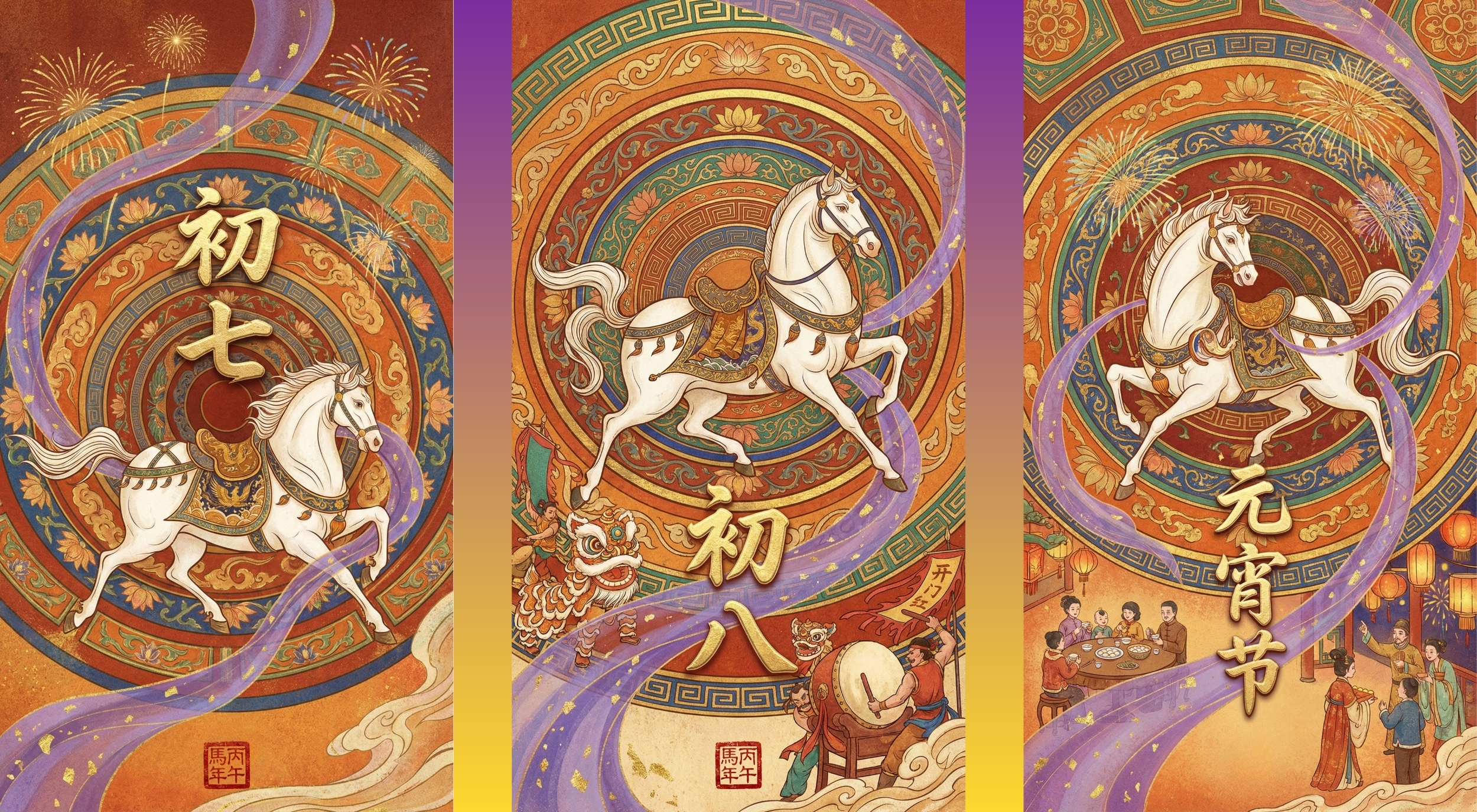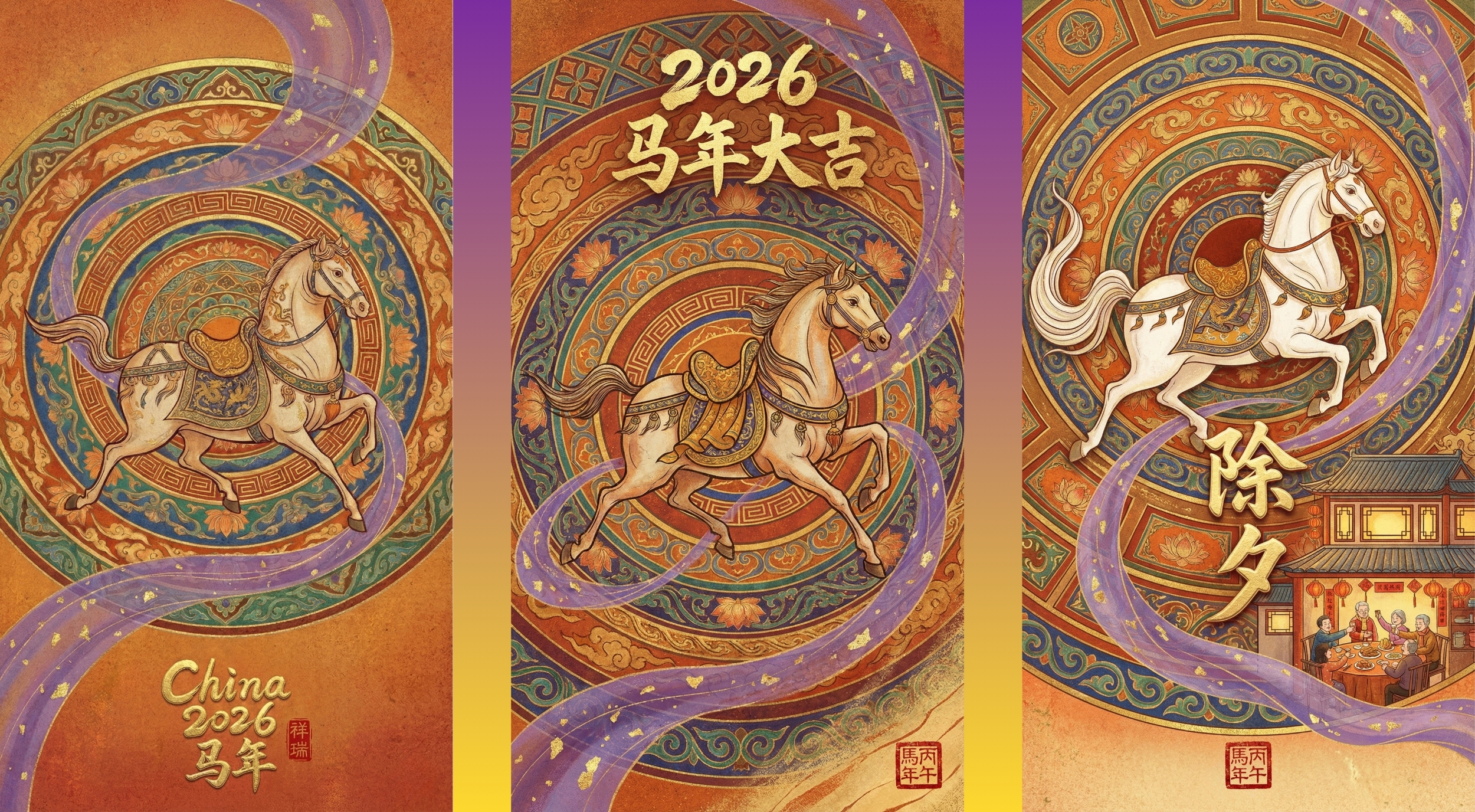 二、丙午马年敦煌国风主题拜年海报展示: