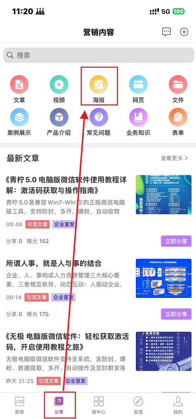 2.打开官微中心 APP,点击底部导航栏的 “分享” 选项,进入“营销海报”页面。