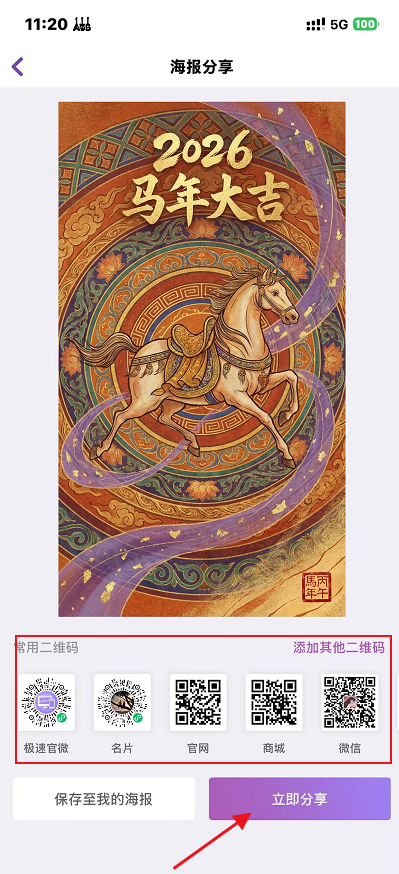 4.在 “海报分享” 页面,可从 “常用二维码” 区域选择需要绑定的二维码(如极速官微、名片、官网、商城、微信等),也可点击 “添加其他二维码” 补充配置。如需保存海报,点击 “保存至我的海报”;如需直接分享,点击 “立即分享” 完成操作。