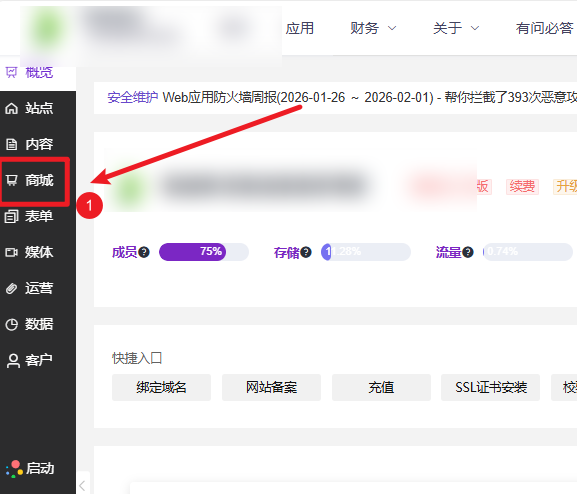 进入官微中心后台后,首先点击左侧主菜单栏中的“商城”模块。