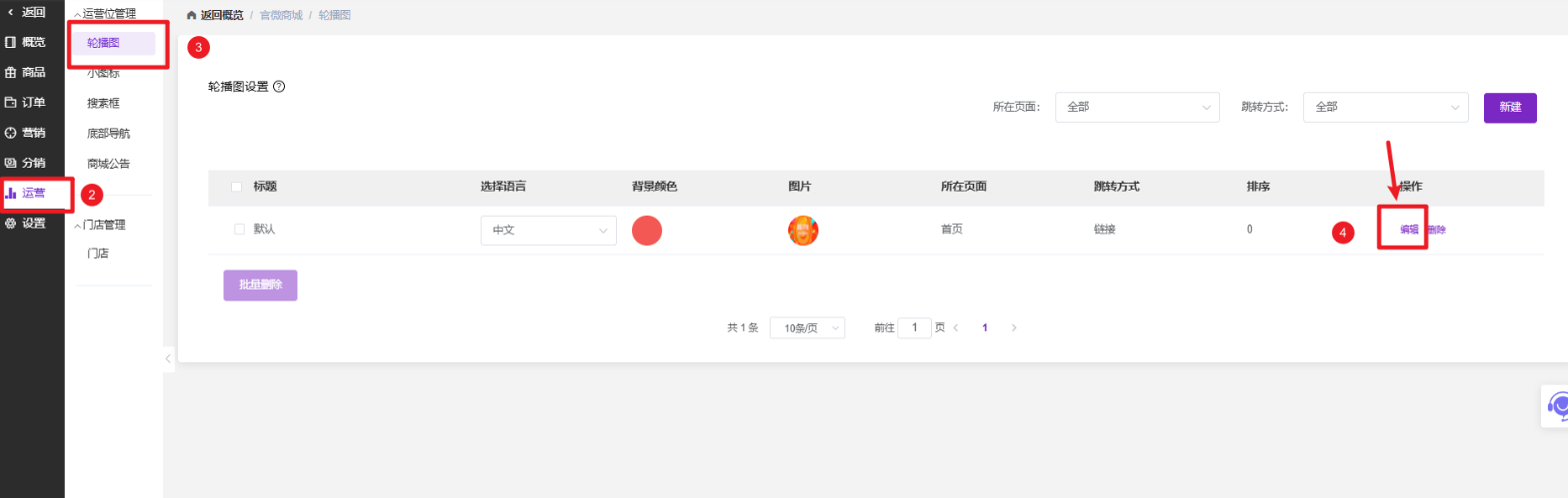 在商城管理界面的次级菜单中,找到并点击“运营”选项,随后在页面上方的功能标签中选择“轮播图”。在轮播图设置列表中,您会看到当前正在使用的图片记录,找到标题为“默认”的那一行。点击该行右侧操作列中的“编辑”按钮,进入详细设置界面。