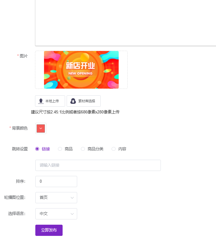 在编辑页面中,您可以点击图片上传区域更换成您准备好的新素材。同时,您还可以根据新图片的内容调整“背景颜色”,并设置“跳转方式”(如跳转到特定商品或微页面),最后点击提交保存即可完成小程序端的同步更新。
