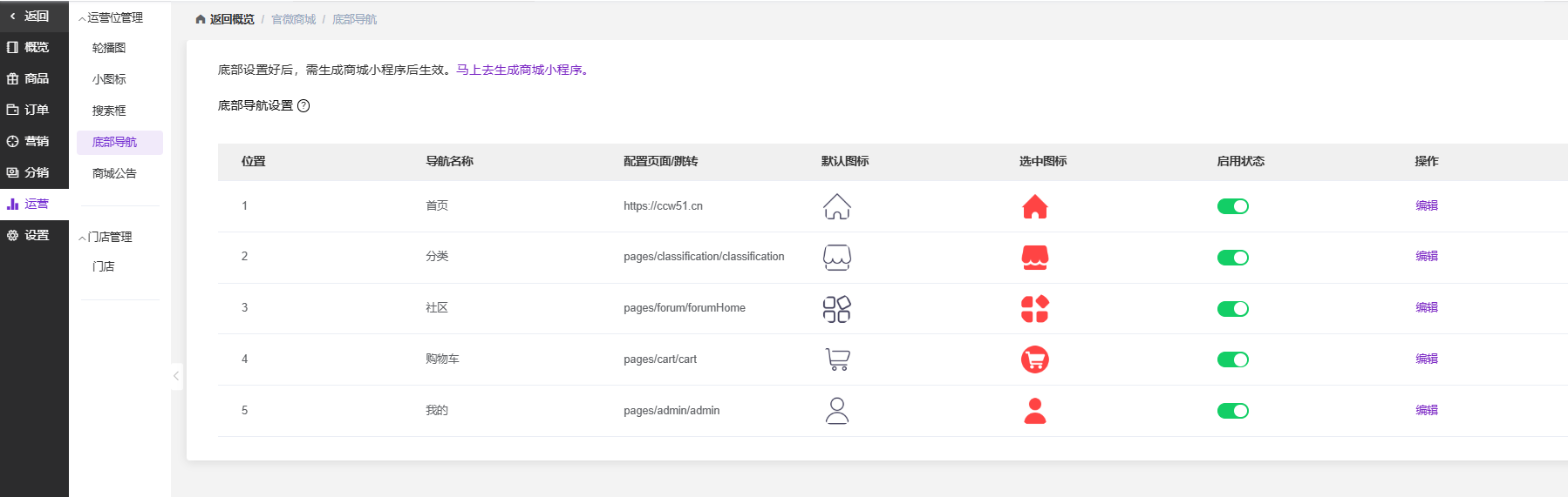 需要注意的是,底部导航属于小程序的全局配置,设置好后请务必点击页面上方的“马上去生成商城小程序”链接,完成小程序的重新生成与发布,这样改动才会同步到用户端。