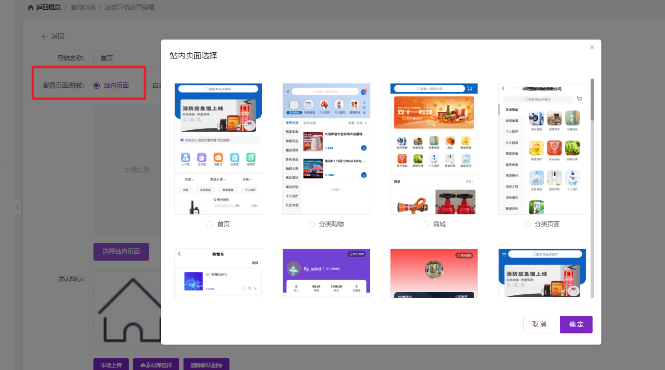 在编辑界面中,您可以直接在“导航名称”输入框里修改文字,比如将“首页”改为“官网”。在“配置页面/跳转”选项中,您可以选择“站内页面”并在弹出的窗口中挑选已有的商城页面,或者选择“自定义链接”来手动输入跳转地址。