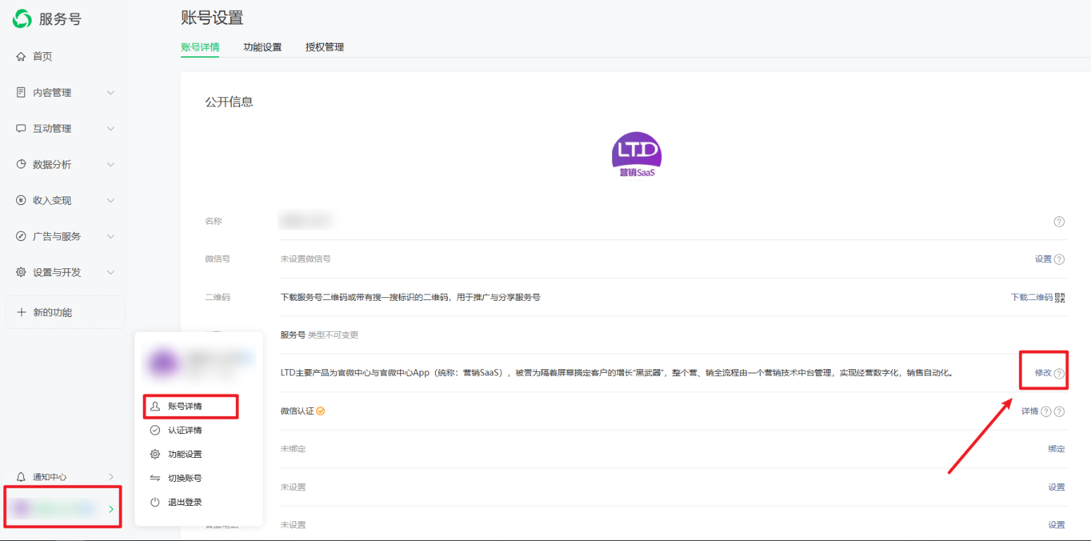 操作路径:微信公众平台—点击左下角账号头像—账号详情;