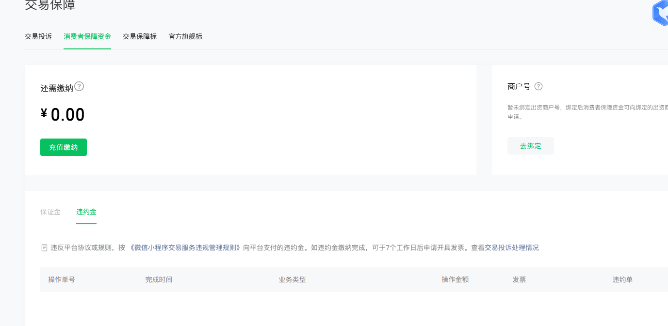 操作路径:微信小程序管理后台(mp.weixin.qq.com)—支付与交易—交易保障—消费者保障资金;