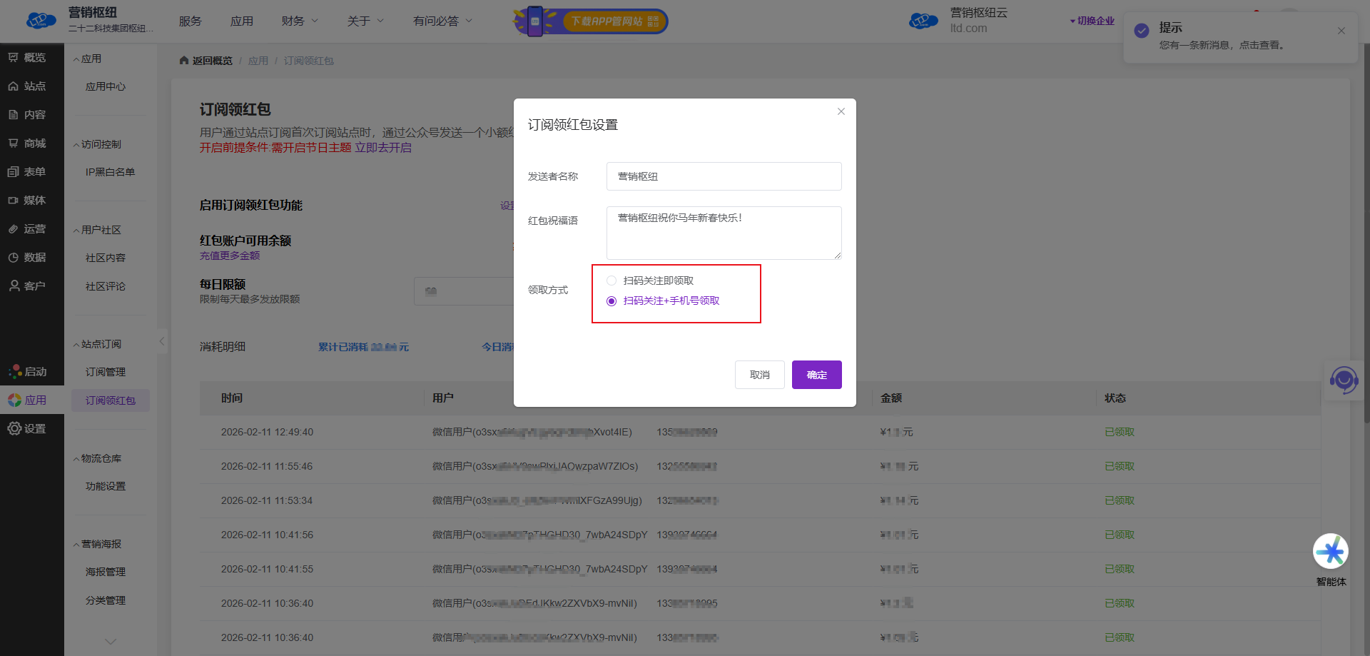 点击“启用订阅领红包功能” 的开关,开启该功能。点击开关旁的【设置】按钮,弹出 “订阅领红包设置” 弹窗。在弹窗的“领取方式”选项中,选择“扫码关注+手机号领取”。