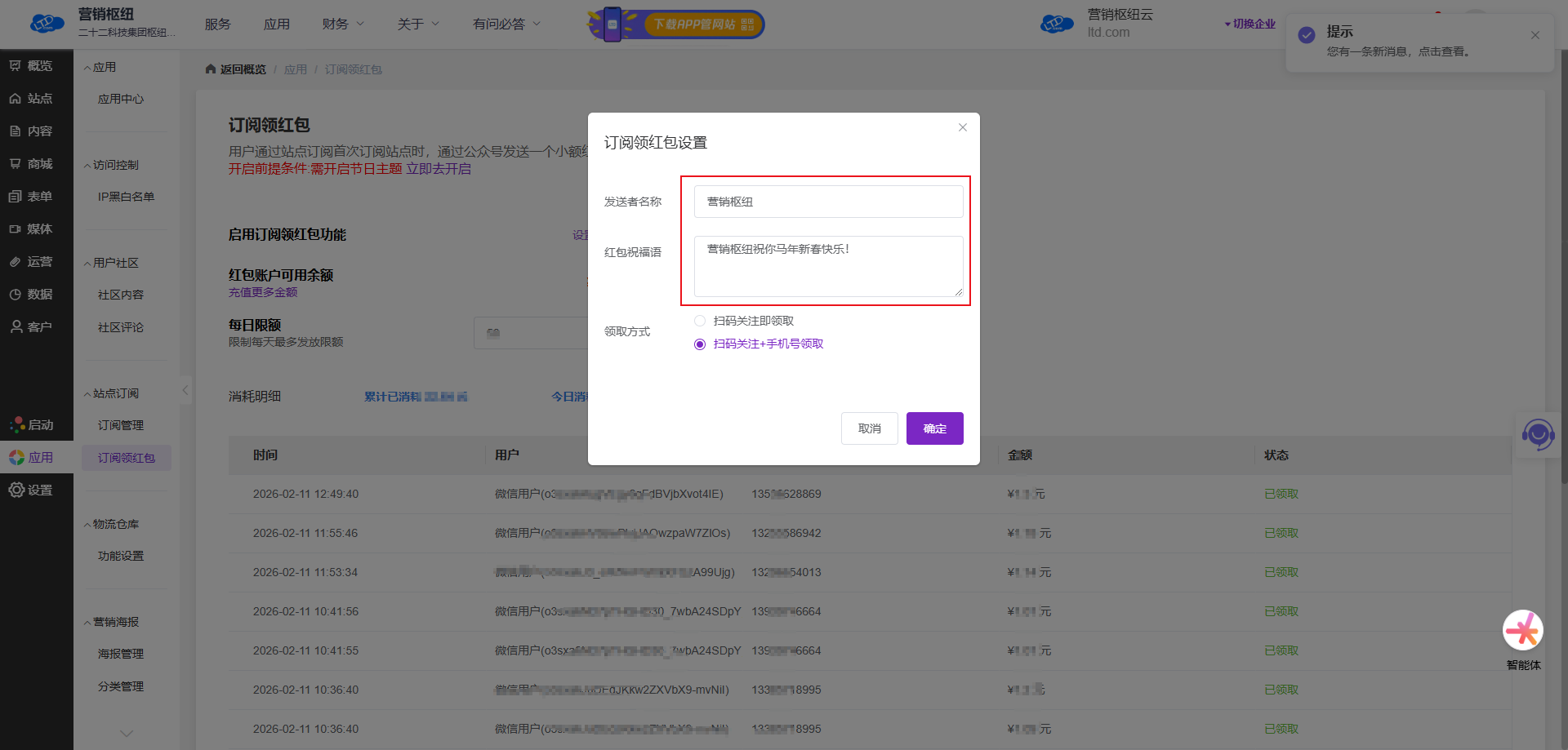 在“红包祝福语” 输入框中,填写自定义祝福内容(如 “营销枢纽祝你马年新春快乐!”)