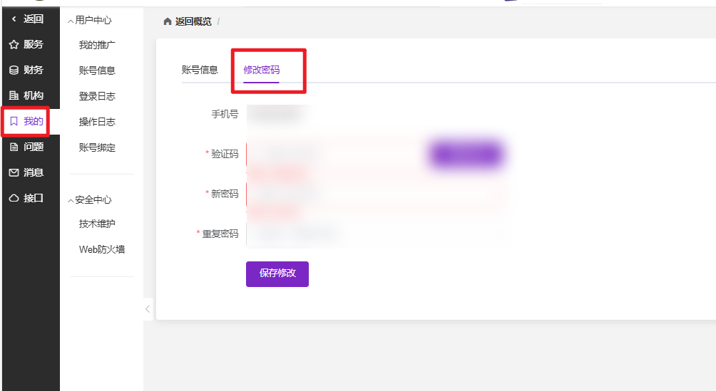 在修改界面中,请确认显示的手机号码无误,并点击获取验证码。输入收到的验证码后,在下方两次输入相同的新密码,最后点击“保存修改”按钮,系统提示成功后,下次登录请使用新密码。
