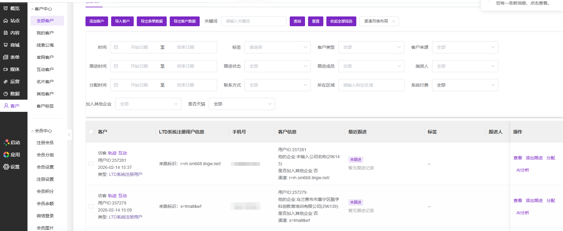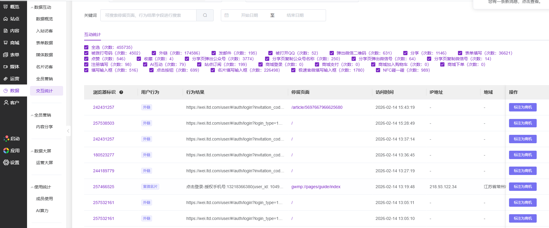 Longjingcha.com运用营销枢纽系统,能记录访客轨迹,为销售跟进提供精准弹药 。哪怕访客没有注册,系统也能识别其点击外链、停留时间等特定访问事件,生成匿名访客画像 。系统会记录全流程的行为时间轴 ,所有线索都会自动汇总到一个CRM客户管理系统中,实现集中管理,让销售跟进有的放矢 。
