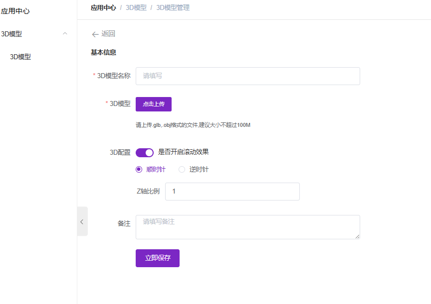 随后点击“3D 模型”下方的“点击上传”按钮,从本地电脑中选择准备好的模型文件。目前系统支持 .glb 或 .obj 格式的文件上传,为了保证前端页面的加载顺畅,建议文件大小控制在 100M 以内。