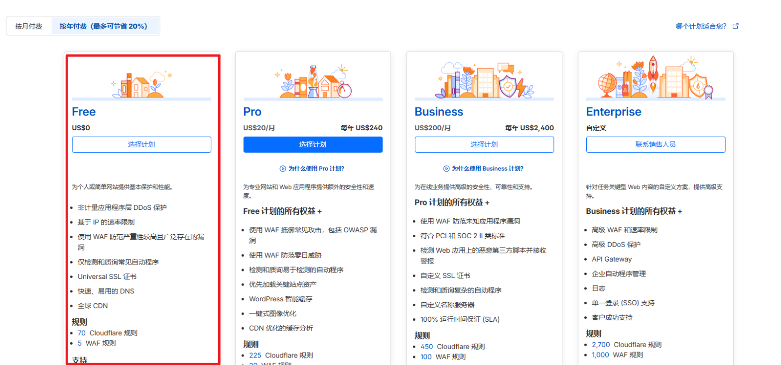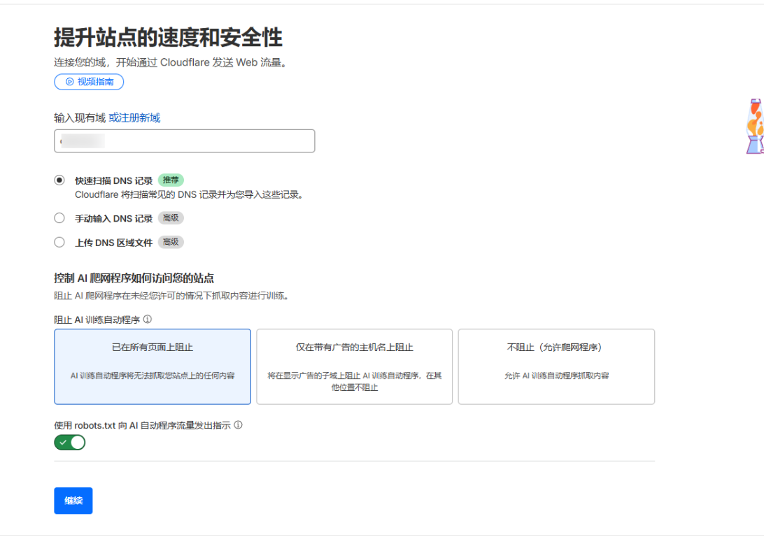 系统会引导您选择扫描方式,建议保持默认的“快速扫描 DNS 记录”并点击继续,随后在计划选择页面中勾选适合您的方案(如 Free 免费计划)并确认。