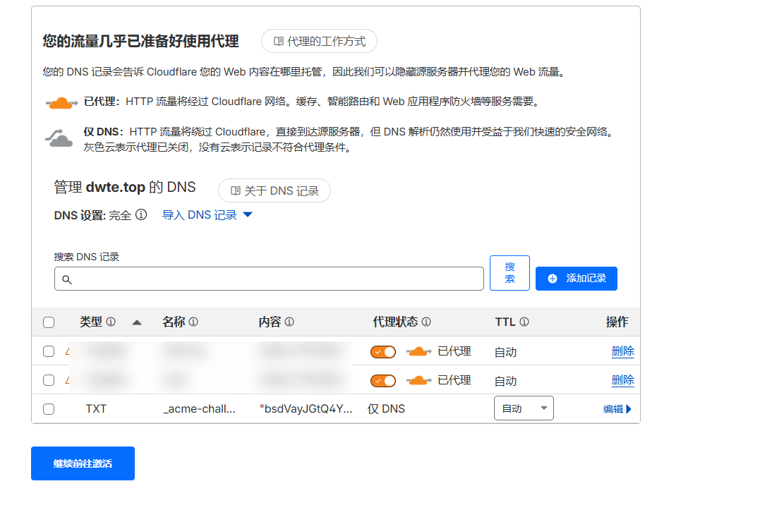 系统会自动扫描该域名当前正在使用的解析记录。在记录列表中,请确保您需要开启防护和加速的记录(通常是 A 记录或 CNAME 记录)右侧的“代理状态”开关已处于开启状态,即显示为“橙色小云朵”。确认记录无误后点击继续,系统会为您分配两组专属的名称服务器地址。