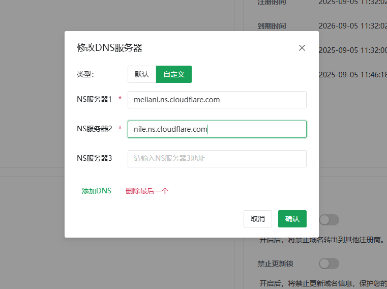 接下来,您需要打开域名购买所在的注册商后台(例如阿里云、腾讯云或域名注册局控制台)。找到对应的域名管理界面,进入“修改 DNS 服务器”或“自定义 DNS 服务器”功能,将原有的 DNS 地址删除,替换为 Cloudflare 刚才为您提供的两组以 .ns.cloudflare.com 结尾的服务器地址。