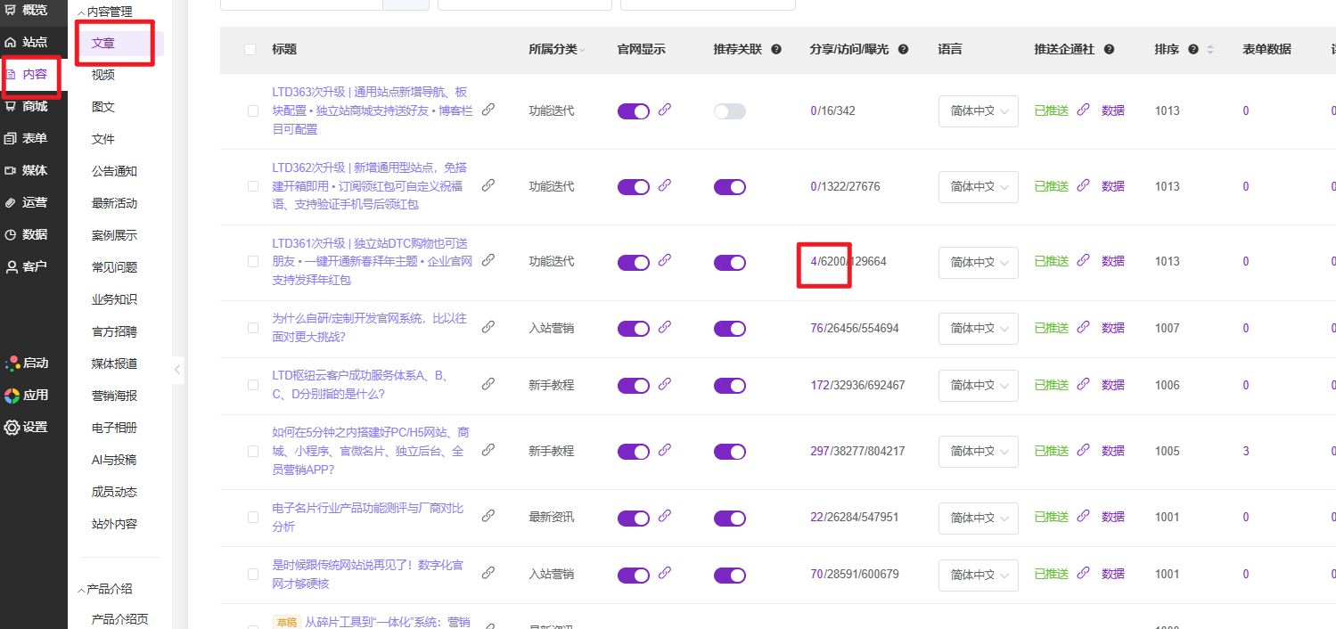 在文章列表中找到您想查看的那篇文章,定位到“分享/访问/曝光”这一列。这一列展示了文章的基础流量概况,点击其中的分享数值,系统将为您跳转到该文章的独立数据详情页面。