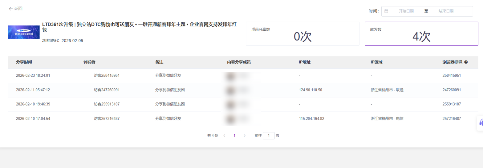 在详细的数据报告中,您可以查看到具体的“成员分享数”和“转发数”。