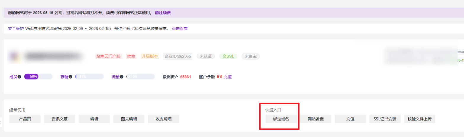 登录进入官微中心后台后,在首页概览页面的右下角找到“快捷入口”区域,点击其中的“绑定域名”按钮,系统将自动跳转至域名管理设置页面。