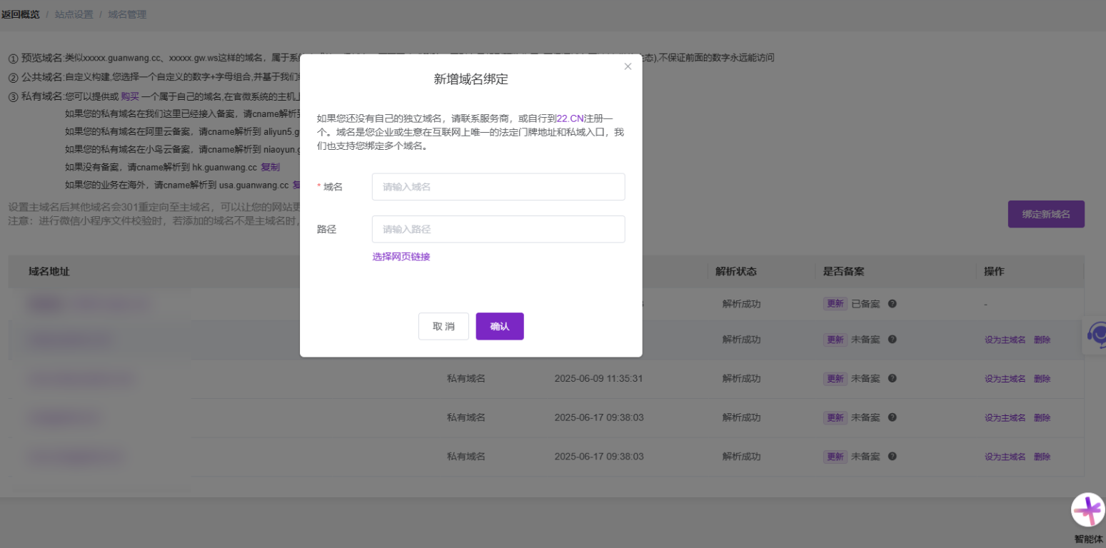 在弹出的窗口中,于“域名”输入框内填写您想要绑定的完整独立域名,并根据实际需求设置对应的访问路径。确认信息无误后点击“确认”按钮,随后您只需按照页面顶部的解析引导,前往域名注册商处完成 CNAME 或 A 记录解析,即可让独立域名正式生效访问。