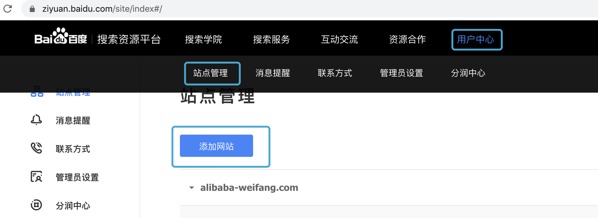 首先需要拥有百度搜索资源平台(https://ziyuan.baidu.com/)的账号,登录后进入用户中心,在站点管理页面点击添加网站,按照提示完成您站点的归属验证。