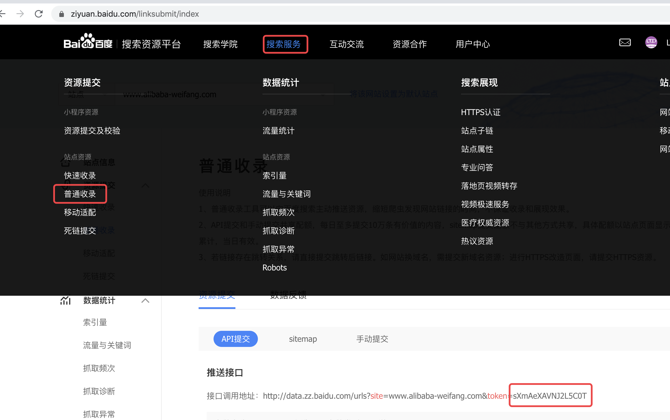 验证通过后,在顶部导航栏选择搜索服务,并在左侧菜单栏中找到普通收录下的API提交选项。在该页面的推送接口代码中,找到并复制“token=”后面的一串字母与数字组合,这就是对接所需的密钥。