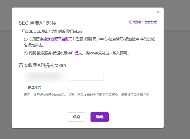 回到官微中心后台,在百度api推送页面点击启用百度自动推送旁边的“设置”按钮。在弹出的SEO百度API对接窗口中,将刚才复制的token密钥准确填入对应的输入框内。
