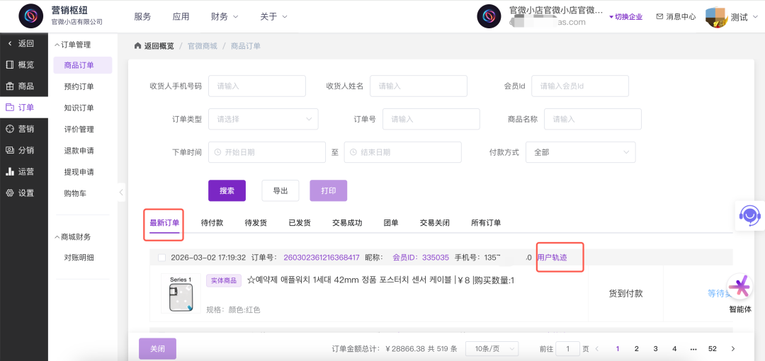 进入商品订单页面后,您可以在“最新订单”或其他订单状态标签下找到您需要查看的目标订单。在每条订单记录上方的基础信息栏中,紧挨着会员ID和手机号的右侧,系统提供了一个紫色的“用户轨迹”快捷链接。