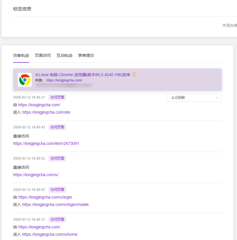 直接点击该“用户轨迹”文字,系统会弹出一个详细的数据窗口。在这个窗口中,您可以通过切换上方的“访客轨迹”、“页面访问”、“互动轨迹”和“表单提交”标签,全面还原该客户使用的浏览器设备、访问的具体页面路径以及每一次跳转的精确时间。