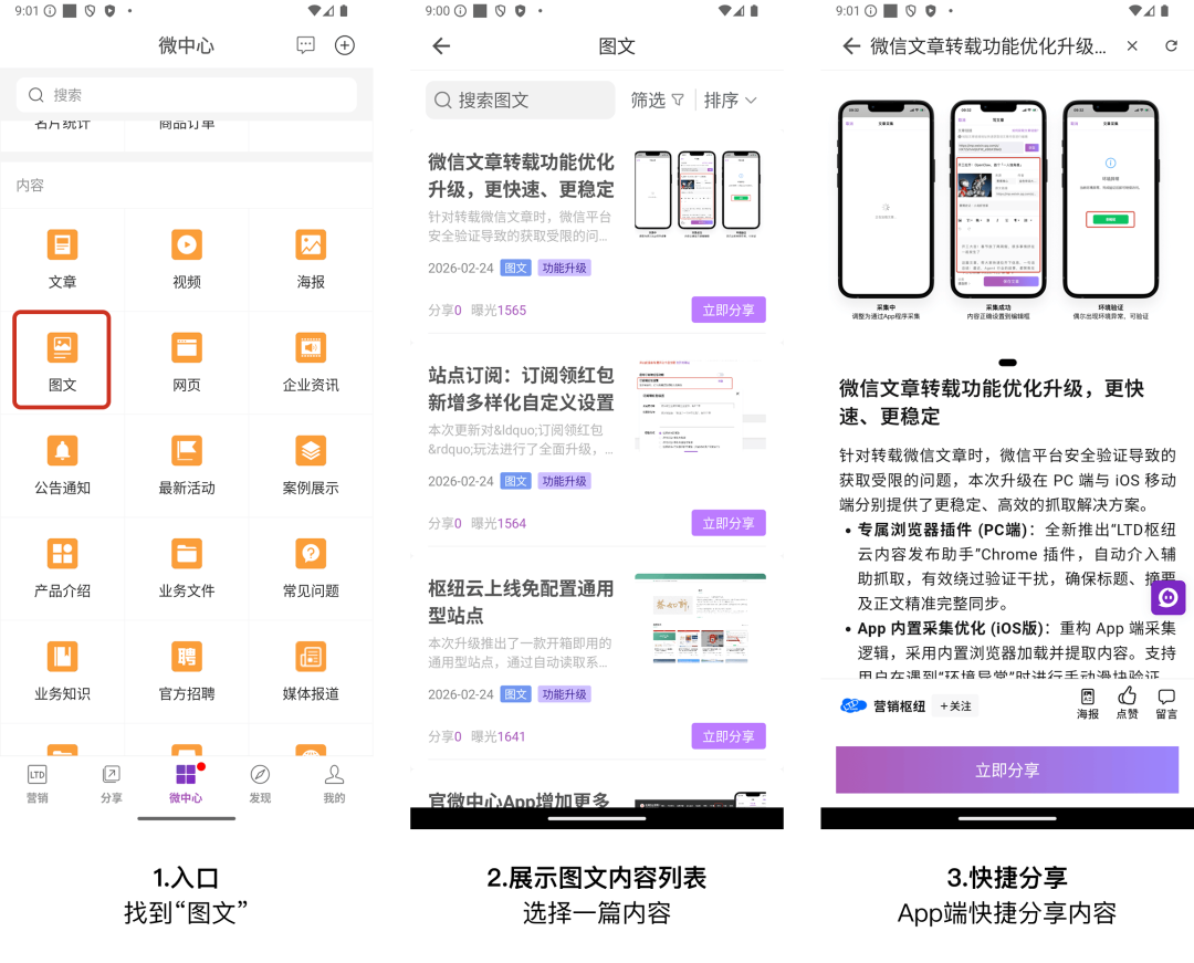 操作路径:微中心 - 内容 - 图文,可展示所有图文类型内容并进行快捷分享