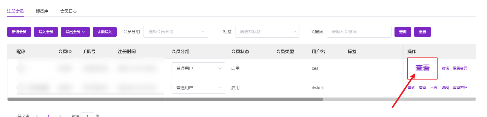 进入「注册会员」页面后,在会员列表中找到对应会员,在该会员所在行点击「查看」按钮(如下图)。如果你已经知道具体用户ID,可以优先核对列表中的会员信息,确认是要充值的目标会员后再进入详情页。
